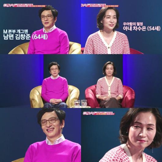 9일 방송될 '애로부부'의 속터뷰에는 60대 중반이라고는 믿을 수 없을 만큼 젊어 보이는 '현재진행형 개그맨' 김창준과 그의 우아한 아내 차수은이 등장한다. 김창준은 "제 유행어로 '아는 사람은 안다니까~'가 있다"며 유쾌하게 인사를 건넸고, 아내와의 사이에 이미 손주까지 두고 있는 다복한 모습을 자랑했다.