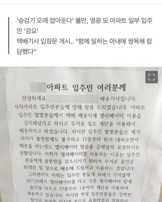 함께 게시된 사진에는 최근 전남 영광군 모 아파트에서 벌어진 택배기사 부부를 향한 입주민 갑질 논란 기사 속 해당 택배기사가 쓴 호소문이 캡처돼 있다. 입주민들은 해당 택배기사가 물건을 배송하는 과정에서 엘리베이터(승강기)를 오래 잡아둔다는 이유로 사용을 금지 시켜 이른바 '입주민 갑질' 논란에 휩싸였다.
