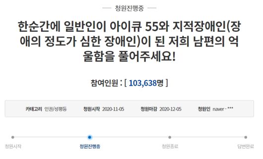 지난 5일 청와대 국민청원 게시판에는 ‘한순간에 아이큐 55의 지적장애인이 된 저희 남편의 억울함을 풀어주세요’라는 제목의 청원 글이 게재됐다.