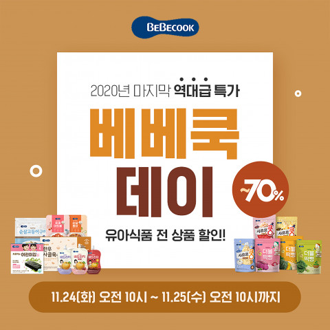 [스타인뉴스 이상백 기자] 영유아식품 전문 브랜드 베베쿡은 11월 24일 오전 10시부터 11월 25일 오전 10시까지 하루 동안 유아식품 전 상품을 최대 70%까지 할인된 가격에 판매하는 ‘베베쿡 데이’ 행사를 진행한다고 23일 밝혔다.