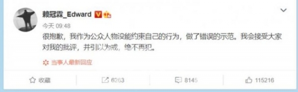 24일 오전 라이관린은 자신의 웨이보에 "죄송하지만 저는 공인으로서 제 행동을 단속하지 못하고 잘못된 행동을 보였습니다. 여러분들의 비판을 수용하고, 다시는 그러지 않겠습니다"라는 글을 적었다.