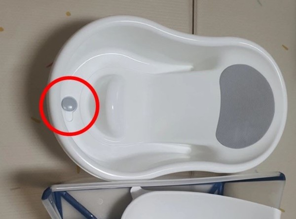 다이소 아기 욕조는 목을 가누지 못하는 신생아를 눕히기 좋고, 다른 업체에 비해 저렴한 가격 탓에 국민 욕조로 자리 잡았다. 그러나 바닥 배수구의 플라스틱 마개가 문제였다.