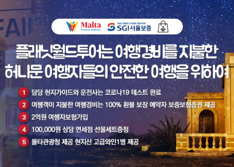 플래닛월드투어는 보다 안전한 여행을 위해 담당 현지 가이드와 운전사는 코로나19 테스트를 완료하고 여행객이 지불한 여행경비는 100% 환불을 보장한다. 예약자 보증보험증권 제공 및 2억원 여행자보험 가입, 10만원 상당의 면세점 선물세트 증정, 몰타 관광청 제공 현지산 고급 와인 1병 제공 등의 혜택도 있다.