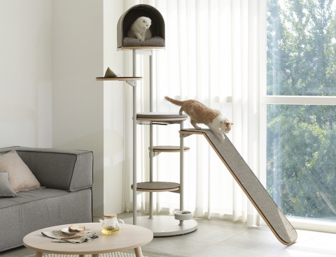 캣타워는 반려묘의 신장 및 나이, 활동성에 맞춰 슬라이드 또는 원형 선반을 추가해 반려묘에게 꼭 맞는 놀이 및 활동 공간을 조성할 수 있다. 선반, 식기, 슬라이드 등의 아이템들은 브라켓을 통해 원하는 높이와 방향으로 직접 조절이 가능해 반려묘의 성향과 집안 구조에 맞게 변형할 수 있는 것이 특징이다. 캣타워의 상부 공간 또한 둥근 숨숨집 형태의 캣콘도, 투명 해먹 등 반려묘의 취향에 따라 선택할 수 있다.