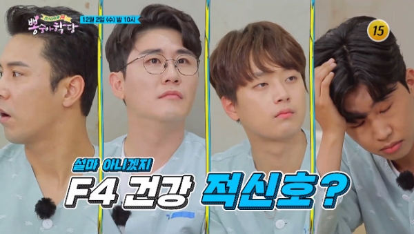 먼저 트롯맨 F4는 이경제 한의사의 특급 한방 처치를 받으며 활력 상태를 체크했다. 멤버들은 발바닥에 위치한 용천혈을 꾹꾹 누르며 호르몬을 끌어올리는가하면, 이경제 한의사가 준비한 '면역 활력탕'을 원샷하며 든든하게 기운을 보양했다. 이어진 대망의 건강검'진'(眞)을 뽑는 시간, 이경제는 영탁의 이름을 외치며 "1천 명 중 1명인 체질을 가진, 올해 본 사람 중 가장 건강한 사람"이라는 극찬을 전해 영탁을 뿌듯하게 했다.