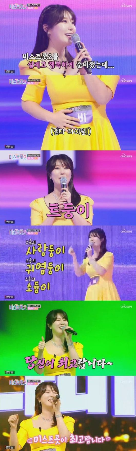 임신 12주차라는 나비는 "'미스트롯2'를 설레고 행복하게 준비했는데, 그래서 그런지 큰 선물이 찾아왔다"라고 입을 열었다. 나비는 "미스트롯을 준비하면서 생긴 아이라서 트둥이라고 태명을 지었다. 트롯의 사랑둥이, 귀염둥이, 소듕이라는 뜻이다"라고 행복한 미소를 전했다.