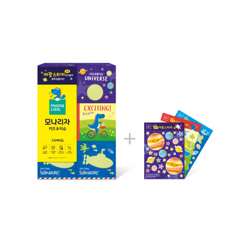 모나리자가 아이들을 위해 밤에도 밝게 빛나는 야광 스티커 3종이 담겨 재미와 실용성을 모두 겸비한 미용 티슈 ‘모나리자 키즈&티슈’를 출시했다