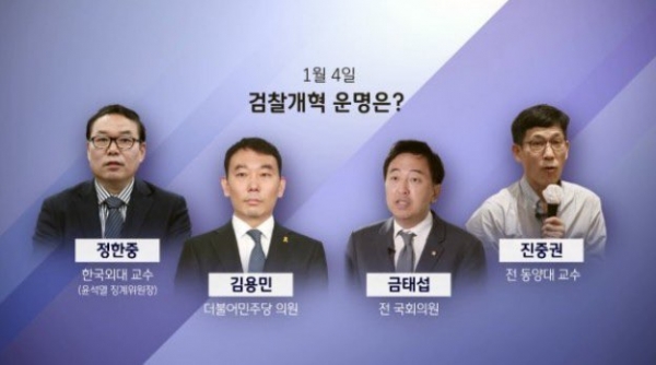 1월 4일은 '정한중' 교수(윤석열 징계위원장), '김용민' 의원(더불어민주당), 그리고 '금태섭' 전 국회의원과 '진중권' 교수가 출연해 "검찰개혁의 운명은?"이란 주제로 토론을 한다. 최근 법원에서 '정직 처분 정지'를 받고 업무에 복귀한 '윤석열' 검찰 총장에 대한 얘기와 공수처 설치 등에 관해 열띤 토론이 이어질 것으로 예상된다.