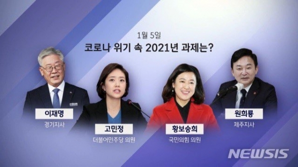 1월5일은 '이재명' 경기도지사, '고민정' 의원(더불어민주당), 그리고 '원희룡' 제주도지사, '황보승희' 의원(국민의 힘)이 출연해 "코로나 위기 속 2021년 과제는?"이라는 주제로 토론을 할 예정이다. 특히 대선 후보로도 언급되는 이재명, 원희룡 도지사가 각각 어떤 식으로 2021년의 코로나 위기를 극복할지 많은 이들의 관심을 모으고 있다.