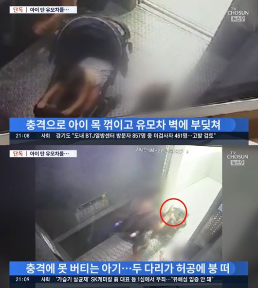 엘리베이터 문이 다시 열리자 양모는 또 탈 때와 마찬가지로 유모차를 세게 밀었고 정인이는 뒤로 넘어졌다. 그 충격으로 두 다리가 잠시 들리기도 했다.