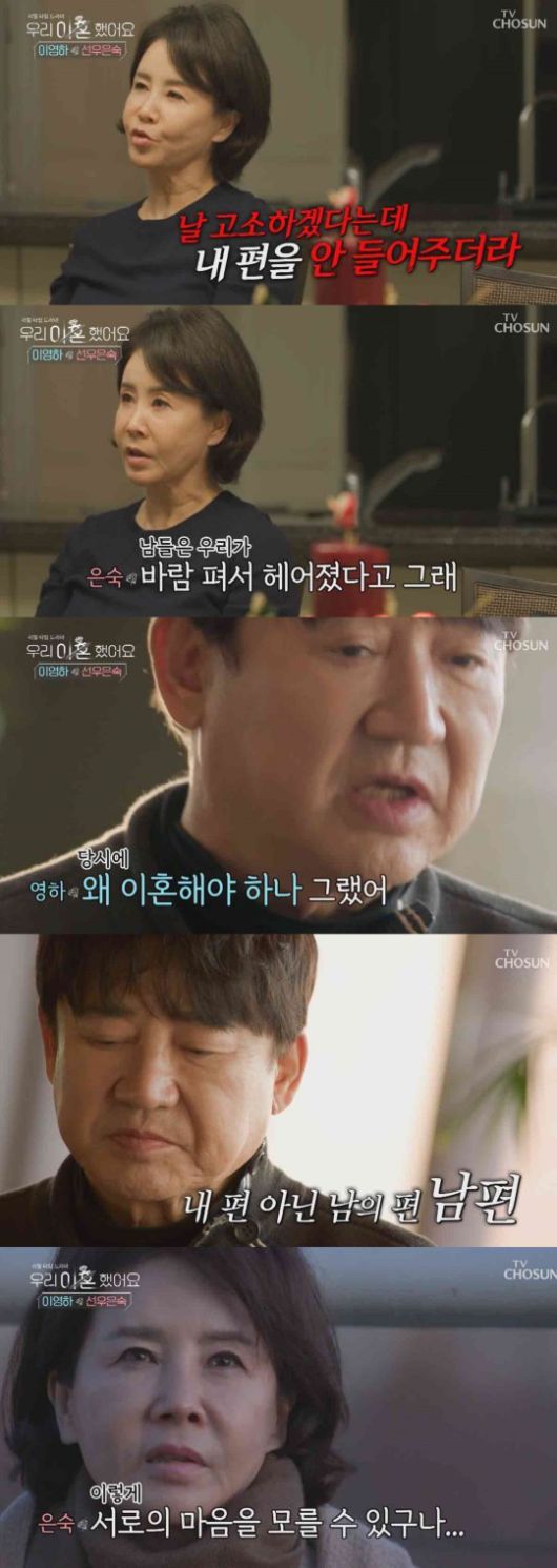 선우은숙은 "많은 사람들이 이영하가 바람을 펴서 이혼하는 줄 아는데 그게 아니다"고 말했다. 선우은숙은 "그 후배가 삼각관계로 다른 남자와 만나는 걸 봤는데 난 그 여자가 뻔뻔한 게 싫어서 상대 남자한테 얘기해 줬지 않냐"며 "이 고소 사건으로 자기랑 내 사이가 6개월 동안 안 좋았고 우리의 이혼이 우리 둘 문제가 아니라 제 3자 때문에 우리 부부가 계속 그러지 않았냐"고 말했다.