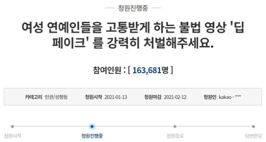 지난 12일 청와대 국민청원 게시판에는 '여성 연예인들을 고통받게 하는 불법 영상 딥페이크를 강력히 처벌해주세요'라는 제목의 글이 게시됐다.