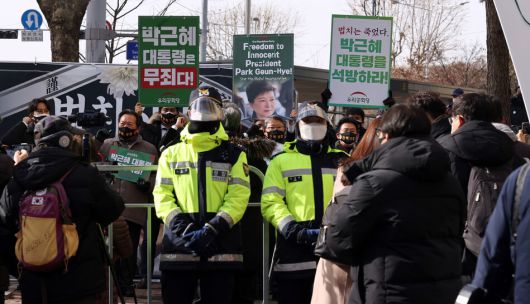 선고 직후 대법원 앞에도 다수의 지지자가 운집한 모습은 보이지 않았다. 서초역 사거리 역시 ‘탄핵 무효, 무죄 석방’ 구호를 재생하는 스피커 소리와 태극기를 든 지지자 3명의 모습만이 전부였다. 20여 명 가량의 경찰 역시 해당 지지자들로부터 거리를 둔 채 지켜볼 뿐 긴장한 모습은 보이지 않았다.