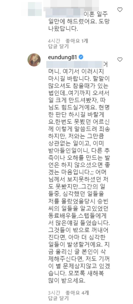이어 "한번도 못뵜던 어르신께 이렇게 말씀드려 죄송하지만 저와는 그만큼 상관없는 일이고, 이미 받아들인일이니 다른 추측이나 오해를 만드는 발언은 하지 않으셨으면 좋겠는 마음이다"라며 "어머님께서 보지 못하셨던 저도 못봤지만 그간의 일들중, 심각했던 일들을 저를 몰랐었을 당시 승빈 씨의 일들을 알고 있었던 동료배우들, 스태프들에게서 많은얘길 들었다"고 운을 뗐다.