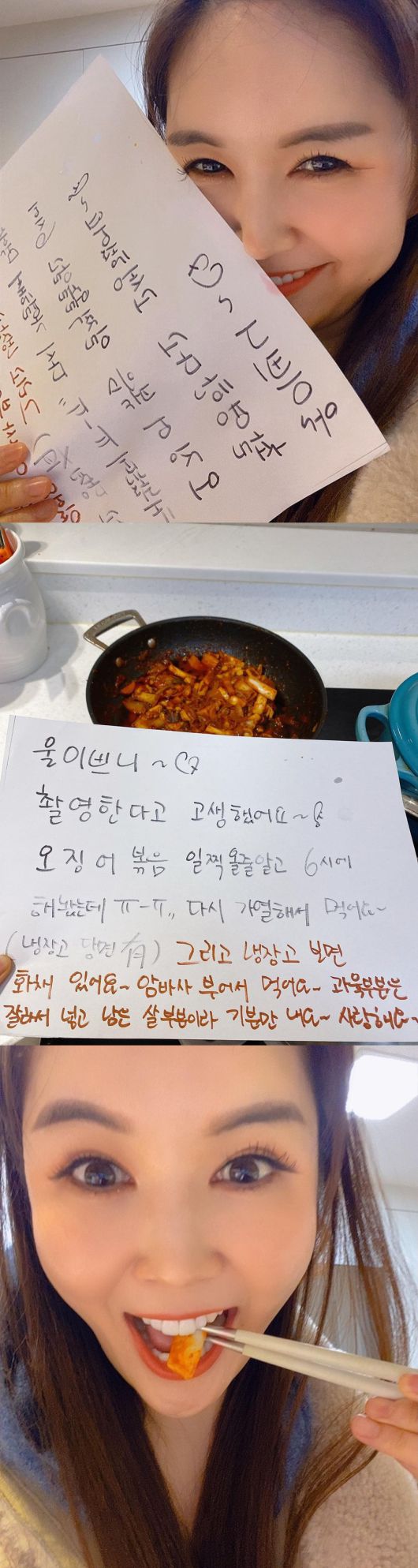 함께 공개된 사진에는 장영란의 남편 한창이 남긴 다정한 편지와 음식이 담겨 있다. 한창은 "울 이쁜이 촬영한다고 고생했어요. 오징어볶음 일찍 올 줄 알고 6시에 해놨는데 다시 가열해서 먹어요. 그리고 냉장고 보면 화채 있어요. 사랑해요"라는 내용을 적어둬 눈길을 끈다.