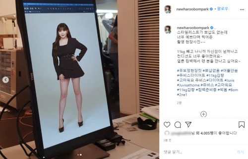 최근 박봄은 자신의 인스타그램에 "스타일리스트가 뽀샵도 없는데 너무 예쁘다며 찍어준 촬영 현장 사진"이라는 글과 함께 두 장의 사진을 게재했다.