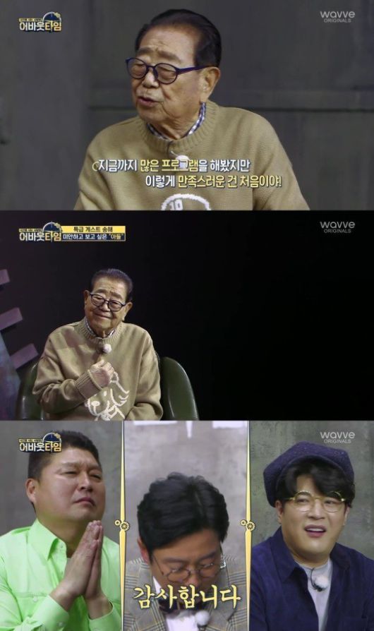 한편 송해는 ‘어바웃타임’에서 경매 전 MC 강호동, 이수근, 신동과 심층 토크에서 눈물을 보이기도 했다. 먼저 세상을 떠난 아들 이야기에 먹먹한 마음을 감추지 못했다. 자신도 방송인이었지만, 아들이 가수가 되는 것을 극구 반대했기 때문이다.