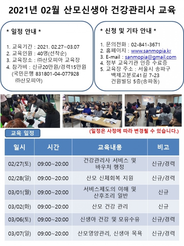 [스타인뉴스 이광우 기자] 프리미엄 산후도우미 파견업체 ㈜산모피아(대표 서정환)가 2021년 첫 ‘산모·신생아 건강관리사 신규자·경력자과정 양성 교육'을 오는 2월에 진행한다고 밝혔다.