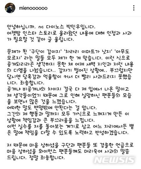 박민우는 "문제가 된 말들 모두 제가 한 게 맞다"며 "공개냐, 비공개냐의 차이지 결국 제 입에서 나온 말이고 제 생각들이었기 때문에 그로 인해 실망하신 팬분들의 모습을 보며 많은 것을 느꼈다"며 고개를 숙었다.