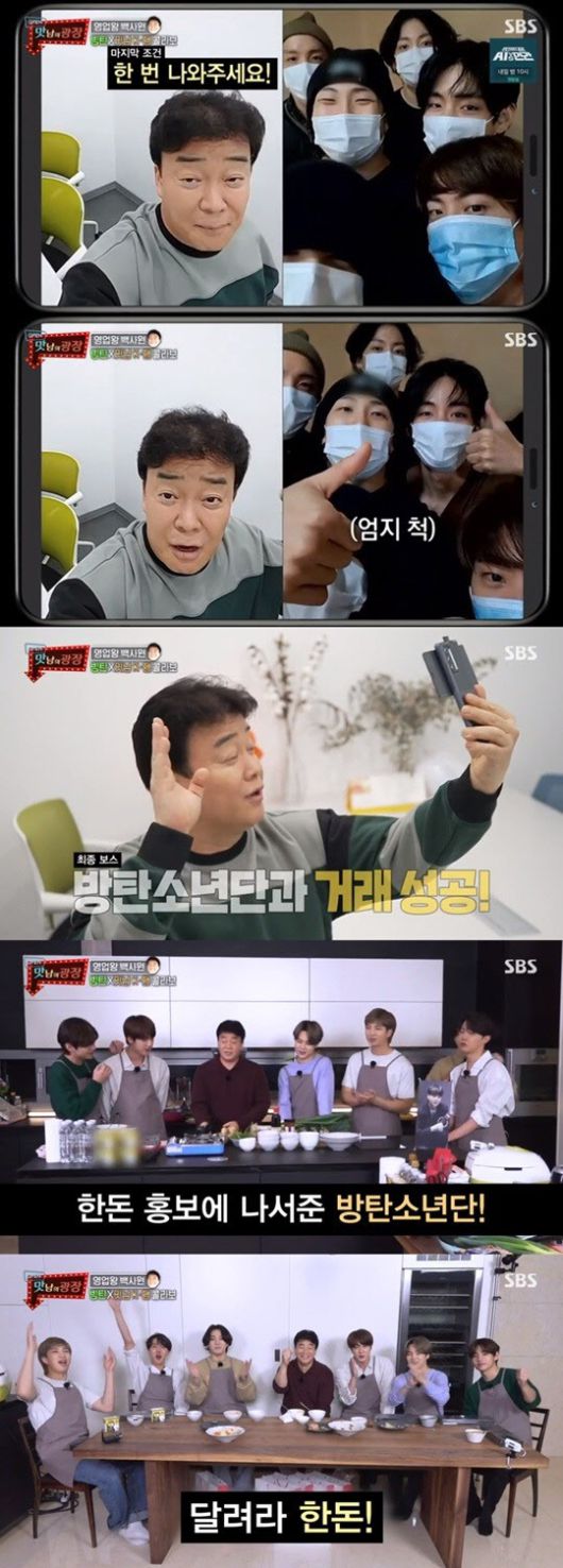 마지막으로 백종원은 K-햄 홍보를 위한 치트키를 사용했다. 바로 방탄소년단이 주인공. 그는 방탄소년단에 "뭐 좀 부탁하려고 한다"라며 한돈 후지살 햄에 대해 설명했다. 그리고 그는 "방탄소년단이 그 햄을 맛있게 먹는 걸 보여주면 홍보에 큰 도움이 될 것 같다"라고 도움을 요청했다.