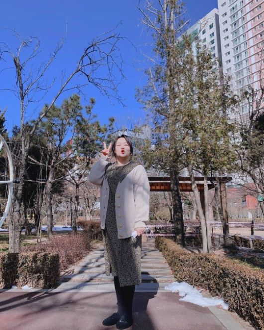 사진 속 하재숙은 원피스에 카디건을 입고 다소 추운 패션을 하고 있다. 하재숙은 입술을 내밀고 귀여운 표정을 짓고 있다.