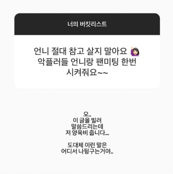 유깻잎은 팬들의 다양한 버킷리스트에 친절히 답하던 중, 악플러를 언급하는 질문에 일각의 루머를 언급했다.