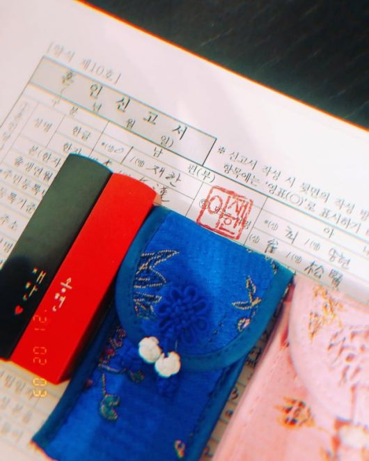 최송현은 지난 3일 자신의 인스타그램에 "'부럽지' 우리 커플 담당 작가 유리미가 선물해준 커플 도장. 결혼 선배님이라 혼인 신고할 때 도장이 필요하다며 예쁘게 이름 새겨 줘서 매우 감동했었는데. 각종 계약서에 내 도장만 사용하다가 오늘 드디어 오빠랑 같이 도장 찍었어요! 결혼식 때처럼 두근두근 떨리는 거 왜 그러는거야"라고 글을 올렸다. 또한 "여뽀 결혼해줘서 고마워요"라는 애교 섞인 해시태그와 "20201203. 20210203. 라임 맞추기"라고 덧붙였다.