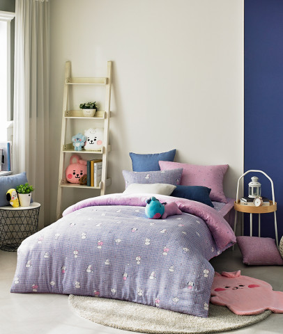 먼저 파스텔톤 컬러에 잔잔한 연보라색 체크무늬가 특징인 ‘굿나잇’은 수면 모자를 쓴 BT21 캐릭터가 오밀조밀 어우러져 잔재미를 더했다. 침구 뒷면은 소프트한 핑크 컬러로 디자인해 양면으로도 사용 가능하도록 했다. 100% 모달아사 소재 제품이다.