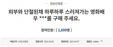 지난 5일 청와대 국민청원 게시판에는 '외부와 단절된 채 하루하루 스러져가는 영화배우 윤정희를 구해주세요'라는 제목의 청원글이 올라왔다. 현재 게시물은 관리자에 의해 실명이 가려진 상태다.