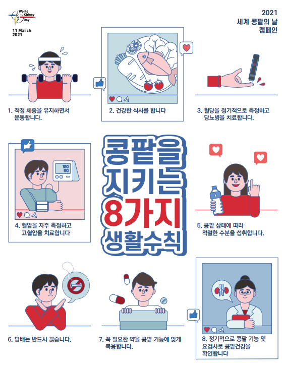 올해 세계 콩팥의 날의 주제는 “콩팥병 관리를 잘하여 건강하게 살자!”며 콩팥을 지키는 8가지 생활 수칙을 정하였다. 양철우 이사장은 “우리나라 투석 환자는 매년 늘어 현재 투석환자수가 10만명을 넘으며 이러한 증가는 우리사회의 고령화와 더불어 당뇨와 고혈압으로 인한 만성콩팥병 환자가 늘어나기 때문이다”라고 밝히고 “이번 홍보의 목적은 평소에 콩팥병 관리를 잘하여 말기신부전으로의 예방과 진행을 억제하는 것”이라고 설명하였다.