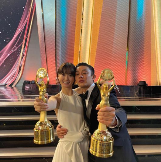 사진 속에는 인기스타상 트로피를 들고 포즈를 취하는 정유미와 유아인의 모습이 담겨 있다. 두 사람은 연예계 대표 절친 중 하나로 잘 알려져 있다.