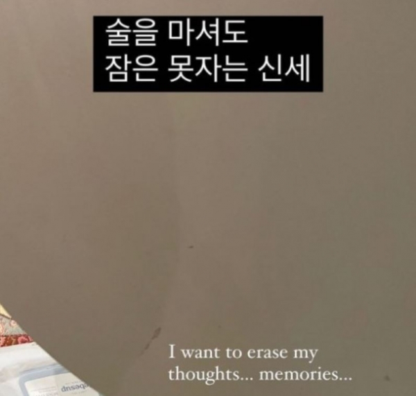 한유라는 자신의 인스타그램에 "술을 마셔도 잠은 못자는 신세"라는 글을 게재했다. 이어 영어로 "I want to erase my thoughts... memories(내 생각들을 지우고 싶다)"라고 덧붙였다. 이러한 힘든 심정을 공개하는 글은 네티즌들의 걱정을 사고 있다.