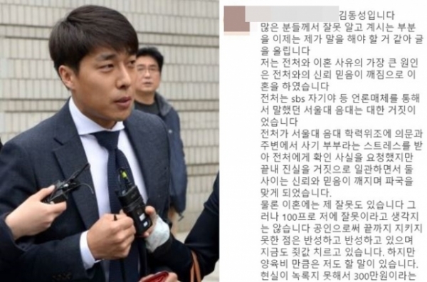 김동성은 “전처의 학력 위조에 대한 의문이 생기고 사기 부부라는 시선에 스트레스를 받았다. 끝내 파국을 맞게 됐다”고 주장했다.