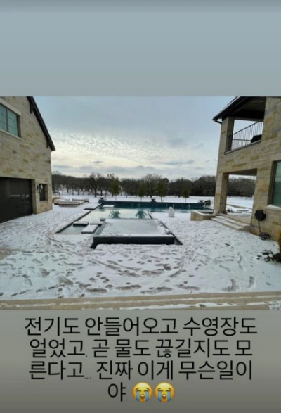 하원미는 17일 자신의 SNS인스타그램 스토리에 “전기도 안 들어오고 수영장도 얼었고 곧 물도 끊길지도 모른다고…진짜 이게 무슨 일이야”라는 글과 함께 사진을 올렸다.