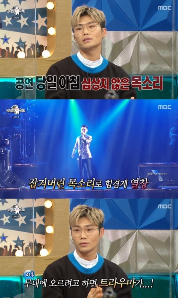 김범수는 17일 오후 방송된 MBC 예능 프로그램 '라디오스타'에 출연, 콘서트 당일 급성 후두염 판정을 받은 뒤 트라우마에 시달리게 됐다고 밝혔다.