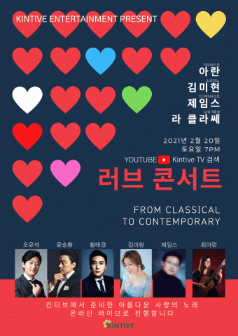 2월 20일 토요일 저녁 7시 유튜브 채널 kintive TV를 통해 비대면 생방송으로 진행되는 이번 공연은 국내에서 잘 알려진 남성 성악중창 ‘라 클라쎄’ 팀과 소프라노 김미현, CCM 아티스트 제임스 그리고 클래식 기타리스트 최아란이 함께 마음을 모아 출연하며 클래식 음악부터 현대적인 노래까지 다양한 장르의 음악을 선보일 예정이다.