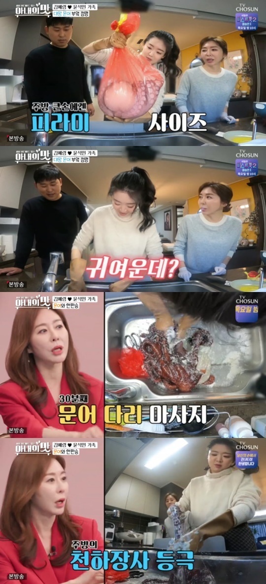 윤석민은 문어를 보며 "살다 살다 이런 큰 문어는 처음 본다"며 혀를 내둘렀고, 김예령은 30분 이상을 문어 손질에 힘 쏟는 딸 김수현의 모습에 "몸살 날 것 같은데 어찌나 잘하던지"라고 흐뭇해했다.