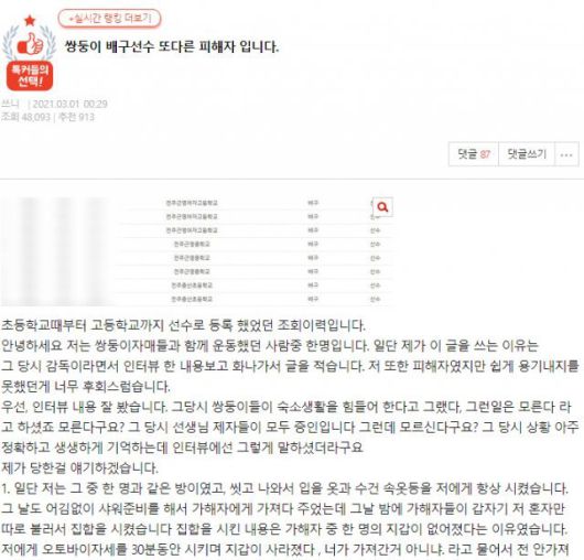 아울러 “시합장에서 경기중 발목을 크게 다쳐 경기를 못뛰게 된 상태로 울고있는 저에게 다가와 욕을하며 ‘아픈 척 하지말고 일어나라. 너때문에 시합 망하는 꼴 보고싶냐. 안아픈거 아니까 이 악물고 뛰라’고 말했다”며 “그날 숙소에서도 다쳤다는 이유로 집합을 당해 욕을 먹었다”고도 했다.