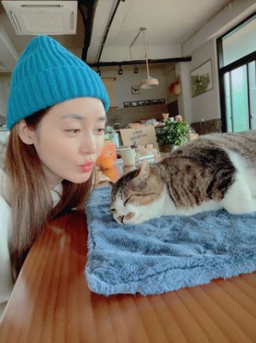 사진 속 성유리는 자고 있는 고양이의 옆에서 포즈를 취했다. 특유의 하얗고 깨끗한 피부가 '동안 미모'를 완성하는 모습이다.