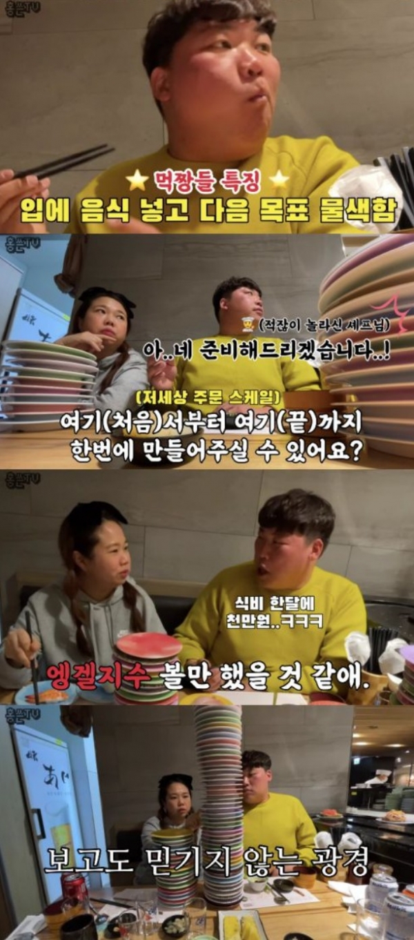 다섯 접시를 먹고 배불러 하는 제이쓴과 달리 홍현희와 천뚱은 지친 모습 없이 초밥을 집어삼켰고 이를 본 제이쓴은 “두 사람이 결혼했으면 엥겔지수 볼만했을 것 같다”라고 진심을 말했고 천뚱은 “식비 한 달에 천만 원”이라고 너스레를 떨기도 했다.