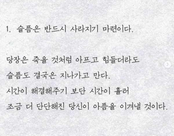 해당 글귀에는 "슬픔은 반드시 사라지기 마련이다. 당장은 죽을 것처럼 아프고 힘들더라도 슬픔도 결국은 지나가고 만다. 시간이 해결해주기보단 시간이 흘러 조금 더 단단해진 당신이 아픔을 이겨낼 것이다"라는 내용이 담겨 있었다.