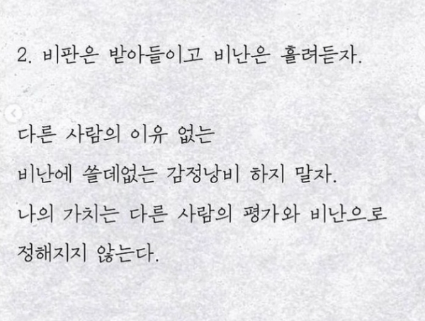 이어 다시 한번 "비판은 받아들이고 비난은 흘려듣자. 다른 사람의 이유 없는 비난에 쓸데없는 감정 낭비하지 말자. 나의 가치는 다른 사람의 평가와 비난으로 정해지지 않는다"는 구절을 담아내며 현재의 상황과 함께 다짐하는 모습들을 보여주고 있었다.