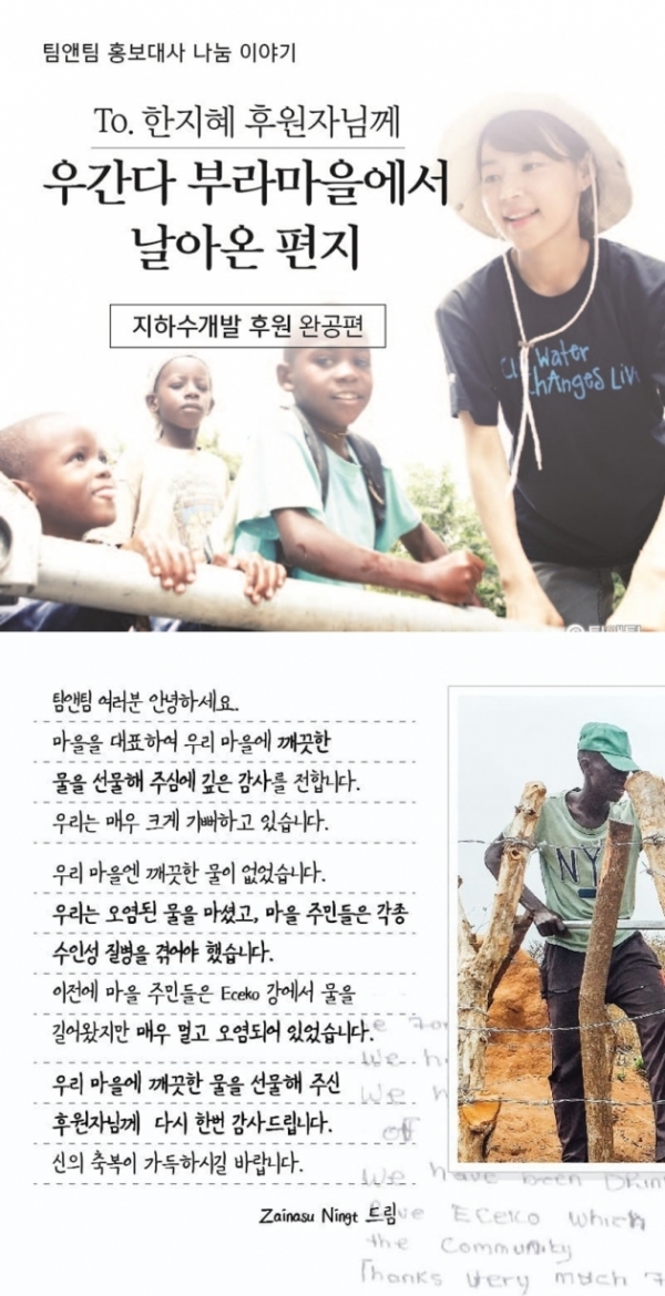 국제구호개발 NGO 팀앤팀(이하 팀앤팀)은 9년째 팀앤팀의 홍보대사로 활동 중인 한지혜의 후원으로 4번째 지하수 개발 우물이 완공되었다는 소식과 함께 우간다 ‘부라 마을’ 주민들이 보내온 편지를 최근 공식 사회관계망계정(SNS)에 게시했다.