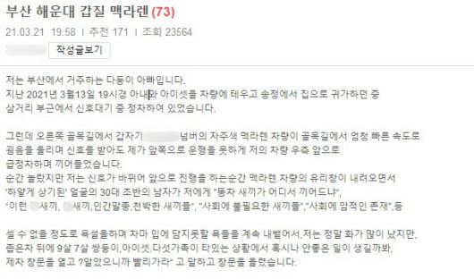[스타인뉴스 이광우 기자] 아이 셋을 태운 차량 운전자가 부산 해운대구 송정동에서 슈퍼카를 탄 운전자로부터 보복운전 피해를 봤고, 그 과정에서 “네 아버지는 거지라서 이런 똥차나 타는 거다”라는 모욕을 들었다고 주장해 논란이 일고 있다.