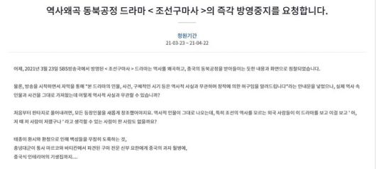 23일 청와대 국민청원 게시판에는 “역사 왜곡 동북공정 드라마 ‘조선구마사’의 즉각 방영중지를 요청합니다”라는 제하의 청원이 등장했다.