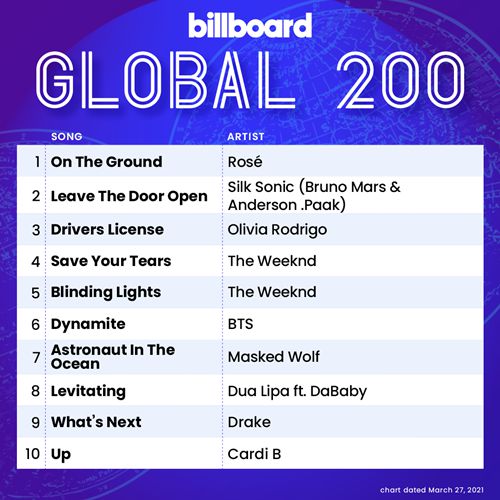 '빌보드 글로벌 200'은 미국을 포함한 세계 200여 지역에서 수집된 스트리밍과 음원 판매량(다운로드)을 토대로 가장 인기있는 노래 순위를 매긴다. 미국 빌보드가 대중음악 시장 최신 트렌드를 반영해 만든 기준이여서 글로벌 메인 차트 중 하나로 새롭게 자리매김 중이다.