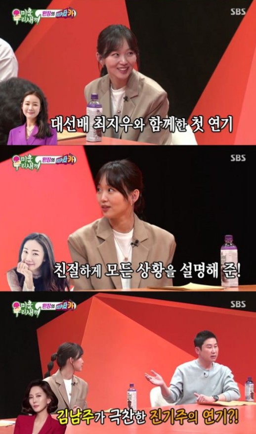 진기주는 드라마 '미스티' 출연 당시 김남주에게 연기 극찬을 받은 이야기도 꺼냈다. 그는 "안 그래도 촬영내내 기간 예뻐해주셨다. 좀 힘들어도 선배님이 예뻐해주시니까 회복이 되고 주눅이 들어도 다시 힘을 냈다"고 회상했다.