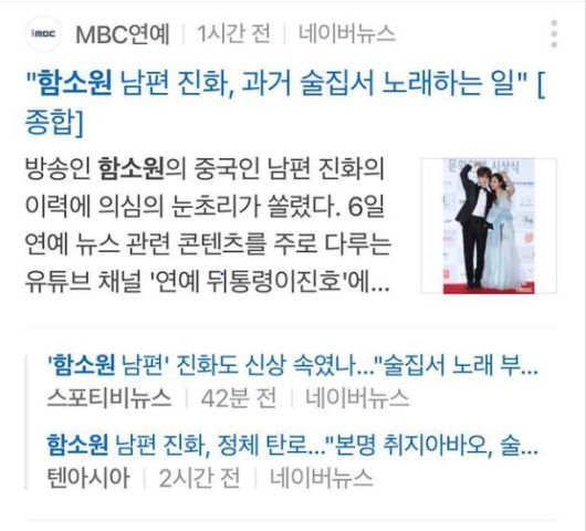 캡처 이미지 속에는 ‘“함소원 남편 진화, 과거 술집서 노래하는 일”’이라는 제목의 기사 등 전날 6일 제기된 남편 진화의 신분 조작설과 관련 기사들이 나열돼 있다.