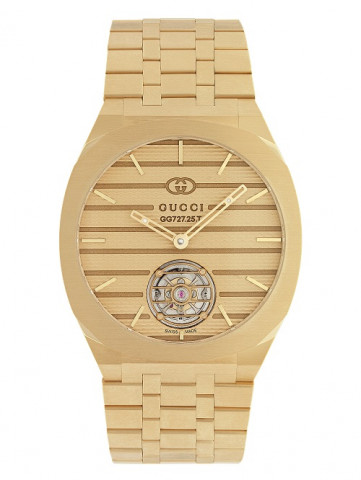 날렵하고 스포티한 느낌의 라인, 그와 대조되는 마감과 뛰어난 기술력을 갖춘 구찌 25H는 하이 워치 컬렉션을 처음 선보이는 구찌에 기준점이 되는 제품으로, 피부처럼 손목에 감길 수 있도록 가벼운 터치감을 제공하는 울트라 슬림 케이스를 적용해 남녀 모두에게 잘 어울린다. 구찌 25H는 스틸과 파베 세트 모델로 출시되며, 플래티넘 골드와 골드가 만들어내는 역동적인 두 개의 뚜르비옹을 적용했다.