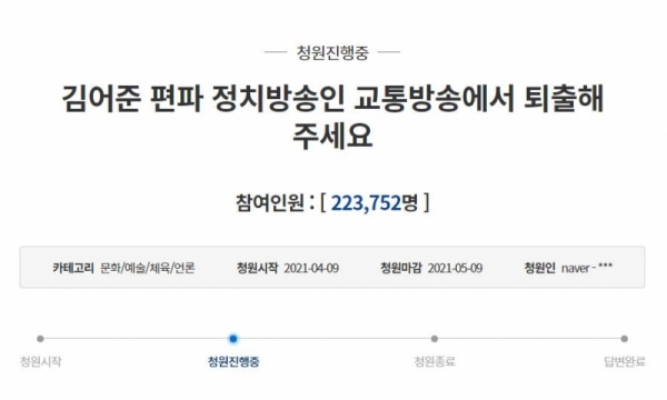 13일 청와대 국민청원 게시판에 올라온 '김어준 편파 정치방송인 교통방송에서 퇴출해주세요' 청원은 지난 9일 시작된지 4일째인 이날 오전 9시20분 현재 21만2545명의 동의를 얻었다.